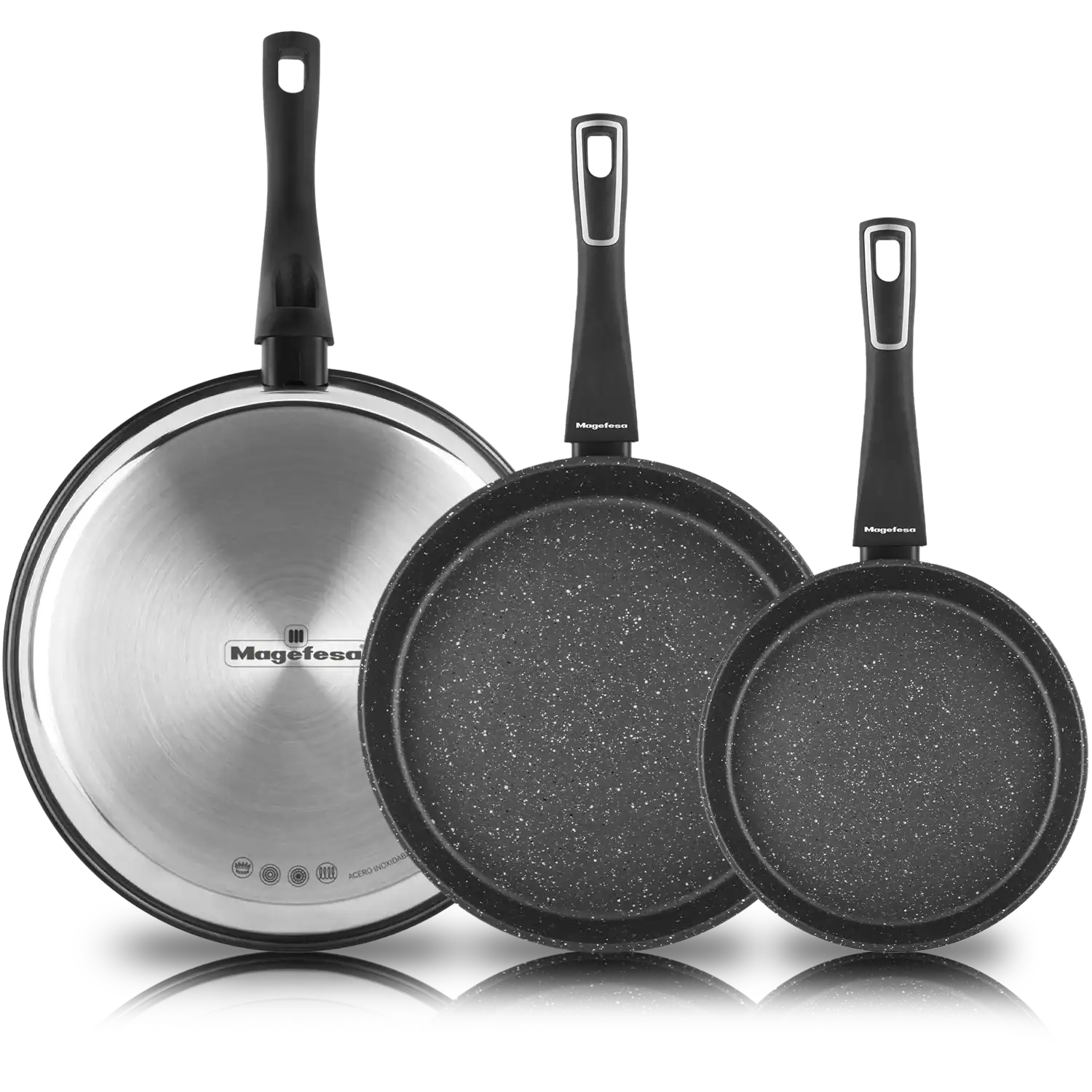 Magefesa Onix Skillet 3-Pieces Set 18/10 Stainless Steel, Works on All Stovetop