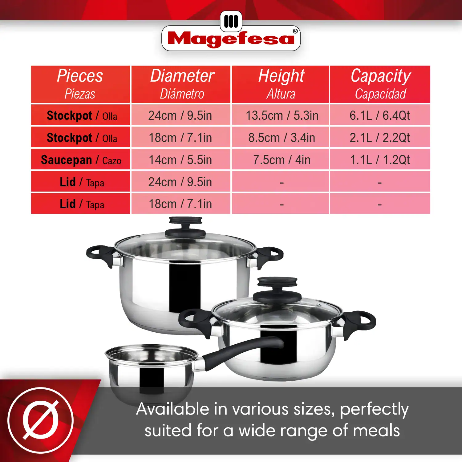 Magefesa cookware sets are meticulously designed with beautifully finished knobs, handles and accesories. Easy to wash, they will always stay shiny.
