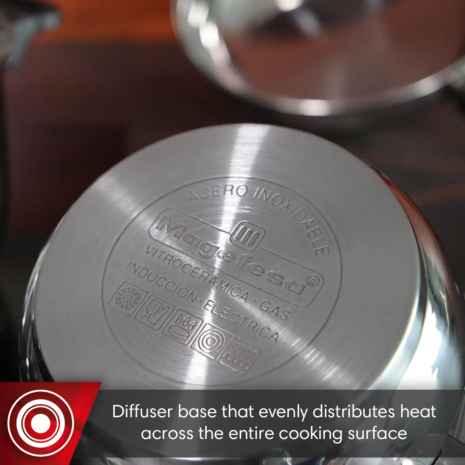 Diffusing bottom that assures a homogenous distribution of the heat. This means your meals cook evenly, no hot spots here. Perfect heat distribution for all your culinary creations with Magefesa Style Cookware Set!