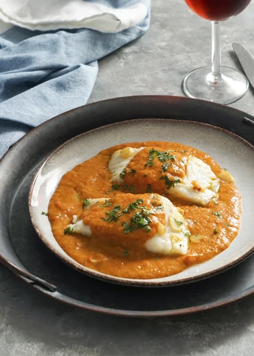 Cut the filets into four 7 oz. pieces and remove bones. Heat the oil in the smaller pan of your Magefesa Frittata pan and place the filets with the skin side down. Close the pan. We are preparing a confit with the cod, not frying it, so it is very important the oil is at a temperature no higher than 260 °F – 300 °F. Cook for about 10 min. Uncover the pan and remove the fillets, let drain on a paper towel. Blend the peppers along with the sundried pepper paste and the fish stockin a Magefesa food processor. Pour the pepper sauce into the pan and cook over low heat. Place the filets on top of the sauce with the skin side up. Close the pan and let cook for at least 5 min. Transfer sauce to a serving dish and then place the cod on top.